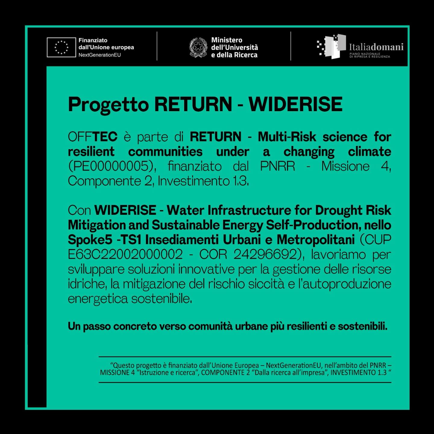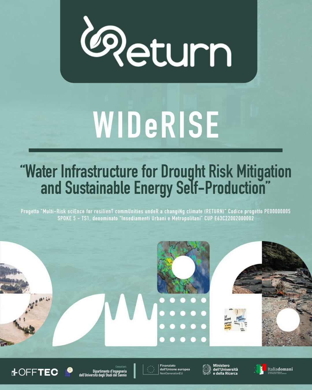 WIDERISE – “WATER INFRASTRUCTURE FOR DROUGHT RISK MITIGATION AND SUSTAINABLE ENERGY SELF-PRODUCTION”, Spoke 5 - TS1 “Insediamenti Urbani e Metropolitani” del Partenariato Esteso RETURN (PE00000005), CUP E63C22002000002, COR 24296692, nell’ambito della Missione 4 – Componente 2 – Investimento 1.3 del PNRR.